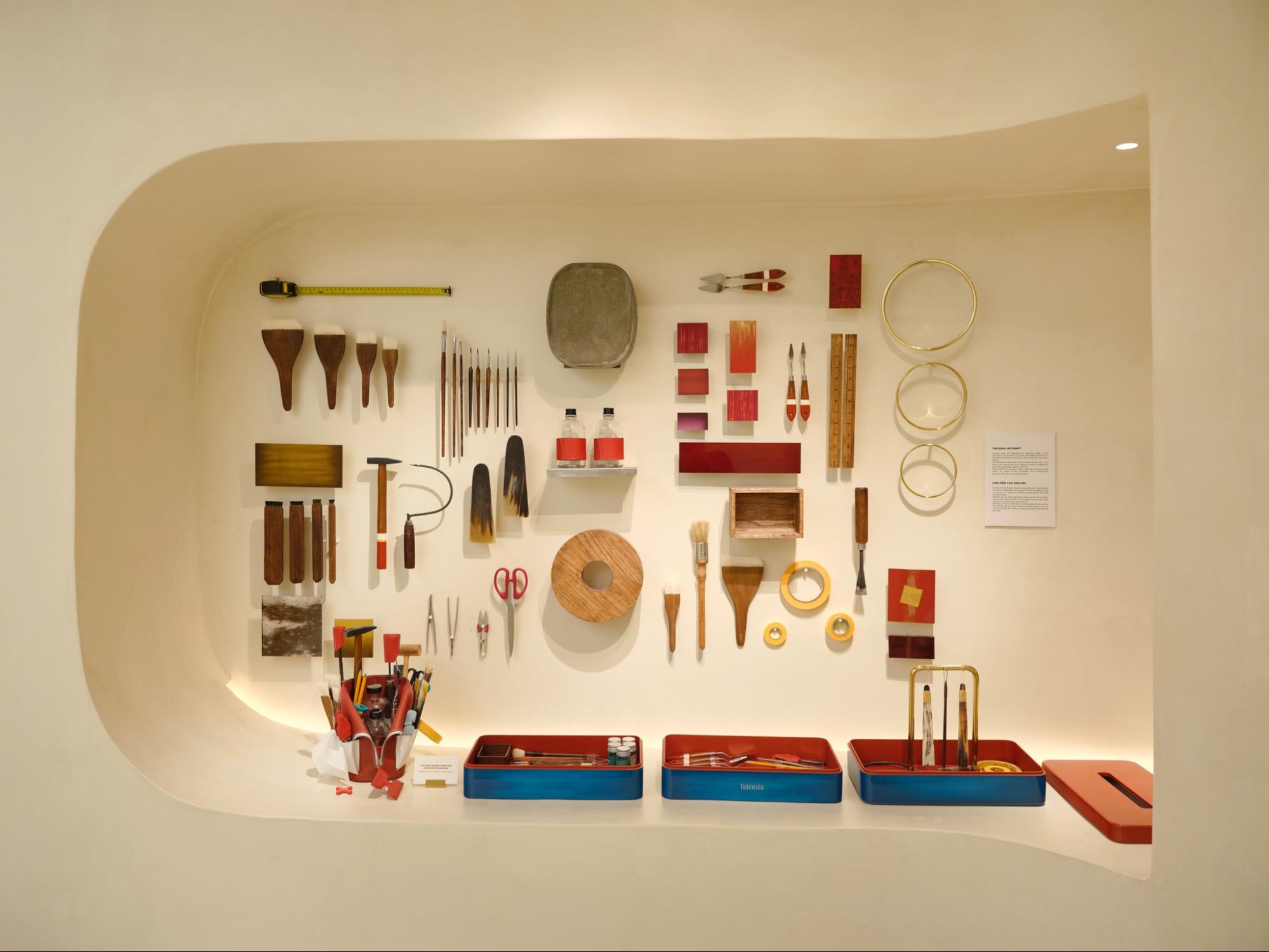 Beyond its main display area, Hanoia invites guests into a world of experience and discovery. A dedicated corner allows visitors to witness, and gently touch the journey of lacquer craftsmanship firsthand. For the first time in nearly two decades, Hanoia unveils the “secrets” behind the making of its creations: each step, each tool, like tiny notes composing a symphony of beauty. This miniature workshop not only reveals the meticulous artistry of Vietnamese lacquer masters, but also serves as a quiet reflection on Hanoia’s journey – a story of craftsmanship, creativity, and cultural pride shared with the world.
