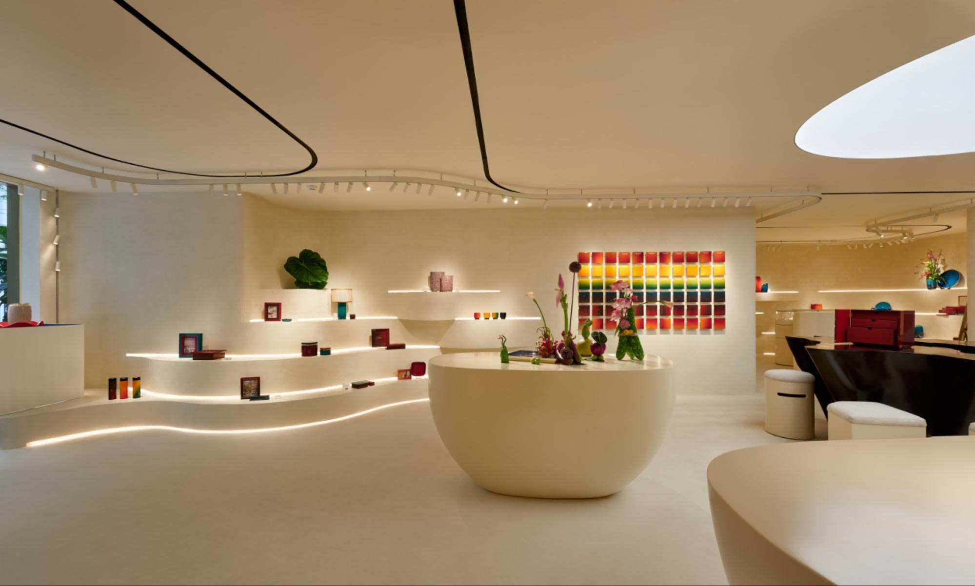 With the touch of G8A Architects — a globally recognized architectural studio, this space becomes a love letter to art, marking a unique intersection on Hanoi’s cultural map. Every detail speaks to the soul of a brand that has been crafting its identity since 1997. From the very façade, Hanoia captivates art lovers with a monumental red brick mural, arranged in the style of traditional luu ly ceramics. Each brick is shaped from the letter “H,” a subtle fusion of local heritage and modern aesthetics. As dusk falls, the Hanoia logo glows softly, illuminating hundreds of red tiles in harmony with a symphony of light designed by renowned Swiss artist Étienne Gillabert — whose work has graced Hermès, Balenciaga, and Van Cleef & Arpels, composing a romantic cultural signature.